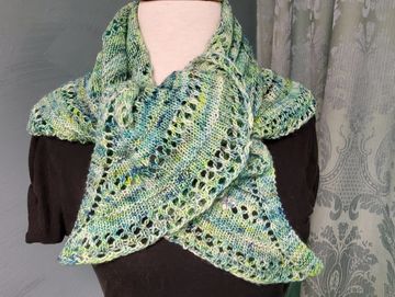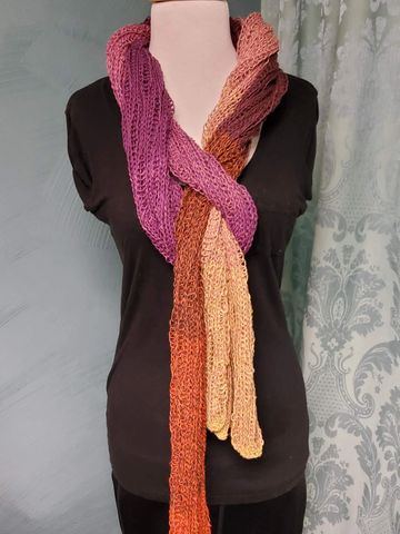 My own design, this scarf is made of ribbon yarn. The bobbles of lace add lots of texture & the generous width adds to the overall design. Ocean is a bright blue to deep navy black tonal ribbon. Night Sky is a purple, grey & black tonal. Mountain Sunset is a variegated ribbon with bright red orange with pops of navy, grey & black. Shamrock is a bright green shading to a dark green.