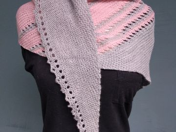 Simply elegant & feminine, this triangular shawl is knitted with a cashmere & merino blend. Blush pink stripes with eyelets of moonstone grey and a delicate picot edge make this shawl one of a kind .
