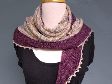 Beautiful merino wool in a muted rainbow of colors accented with a deep Merlot/purple edge. A lovely, airy circular piece that can be worn all year long. SOLD- I can make a custom piece similar to this shawl.